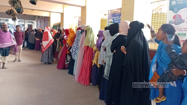 বৃহস্পতিবার সকাল পৌনে ৮টায় শাহজালাল জামিয়া ইসলামিয়া মাদ্রাসা কেন্দ্রে নারী ভোটারদের লম্বা লাইন ছিল।